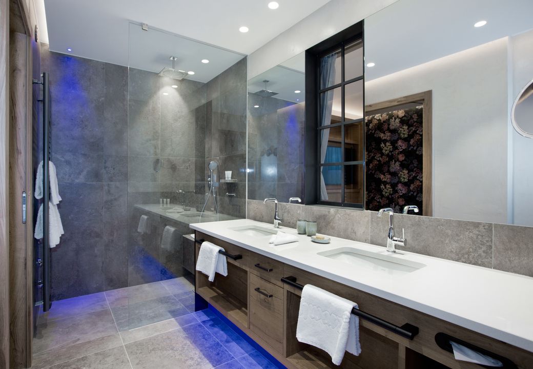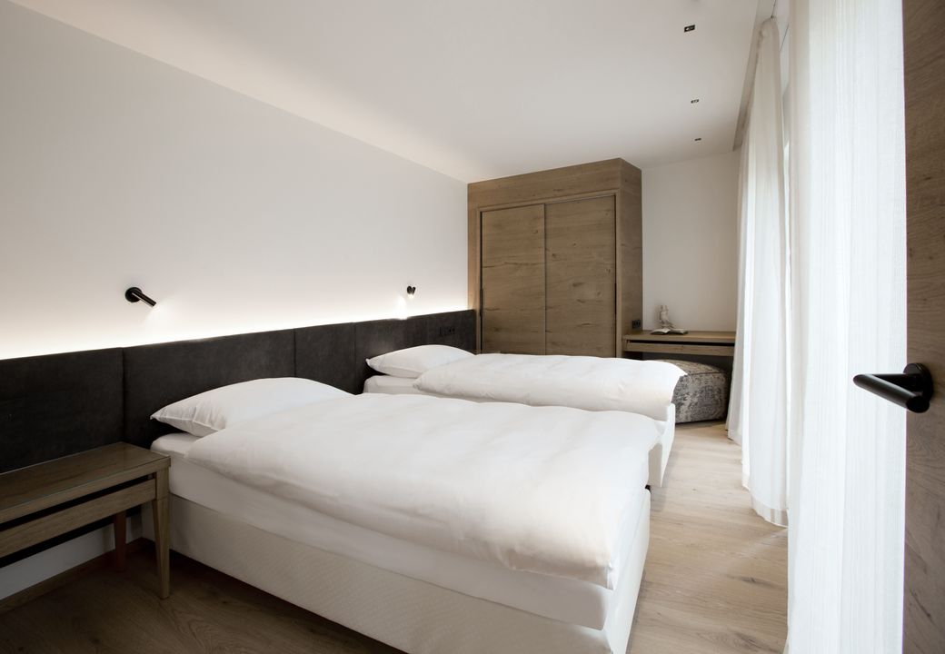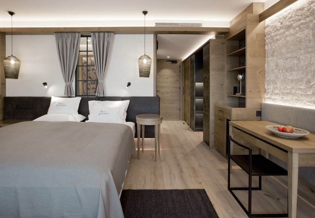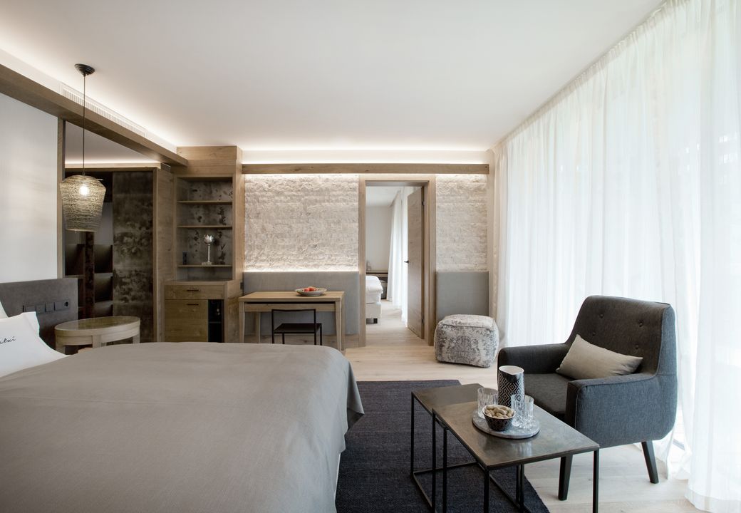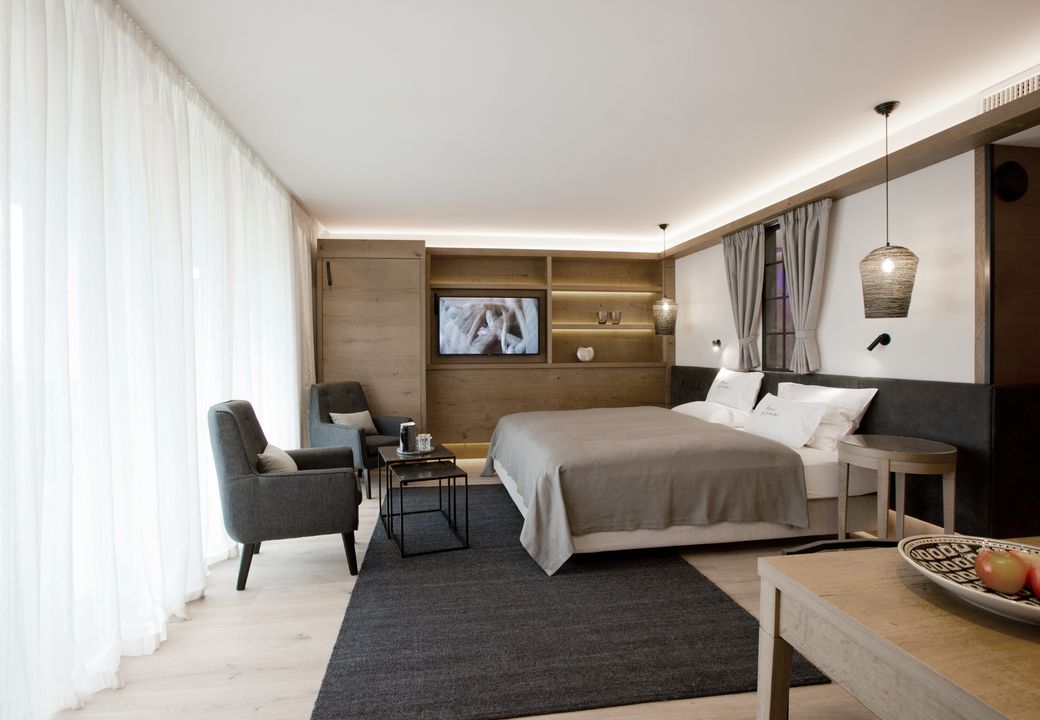 Holzboden, Schreibtisch, Sitzecke, Minibar, TV-Radio, Badezimmer mit Dusche, Doppel-Waschtisch, WC separat mit Bidet, King Size Doppelbett, großzügiger Balkon. Kinderzimmer mit ca. 15 m², 2 Betten und TV-Radio.