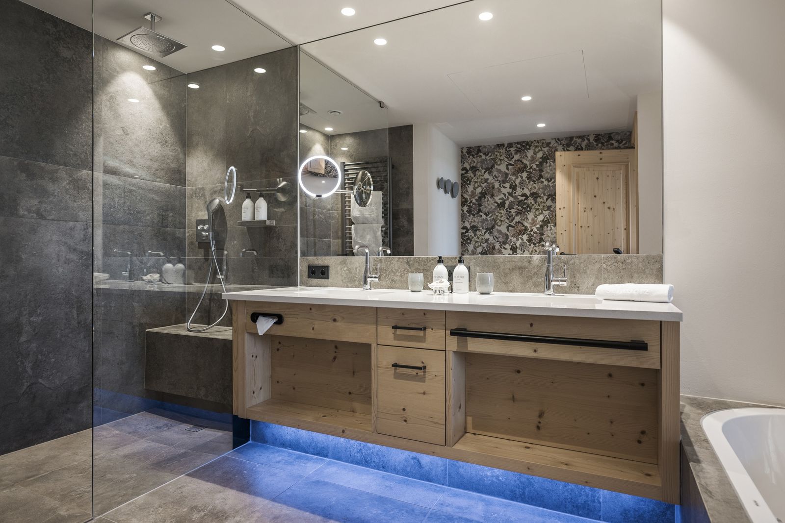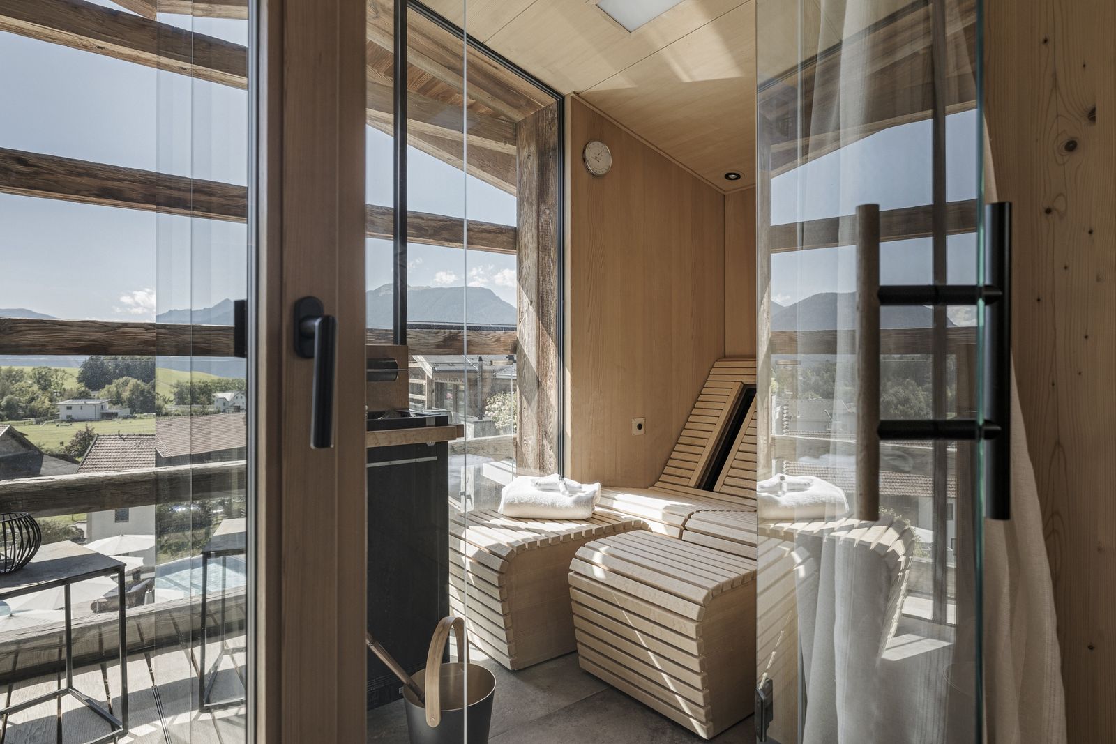 luxuriöse Dachsuite, klimatisiert, Holzboden, Wohnzimmer, großzügige Lounge-Küche, Weinschrank, Wohn- und Essecke, Lounge-Balkon, Bad mit Dusche, Waschtisch, WC. Stiege zu Maisonetten-Schlafzimmer mit King Size Doppelbett, Schrankraum, Balkon. Großes Badezimmer mit Badewanne, Dusche, Doppel-Waschtisch, WC separat mit Bidet. Zusätzlich Kinderzimmer, 2 Betten, Schreibtisch TV-Radio, Badezimmer mit Dusche, Waschtisch, WC. Panorama-Sauna mit Infrarotliegen.