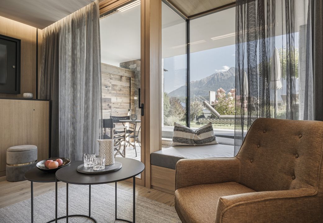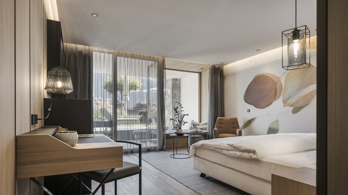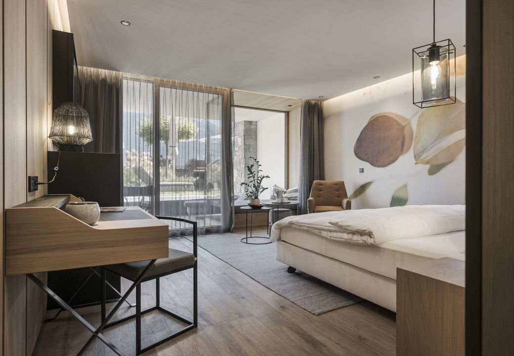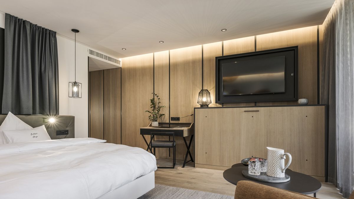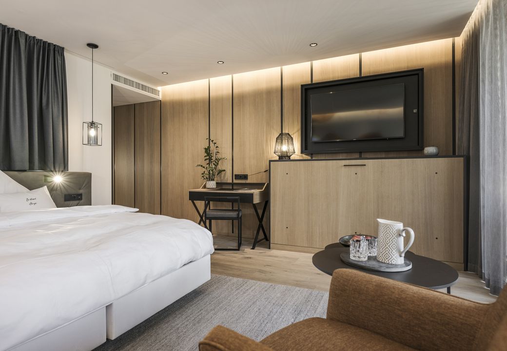 Modern ausgestattetes helles Doppelzimmer, hochwertiger Holzboden, Klimaanlage, großer Balkon oder Terrasse mit Ruheliege. Kingsize Doppelbett und Panorama-Sitzecke. Teilweise mit Hängesessel. Bad mit Dusche und Badewanne, Doppel-Waschtisch, WC separat.