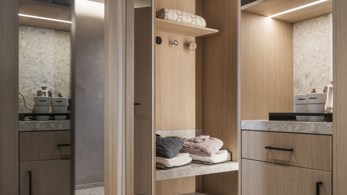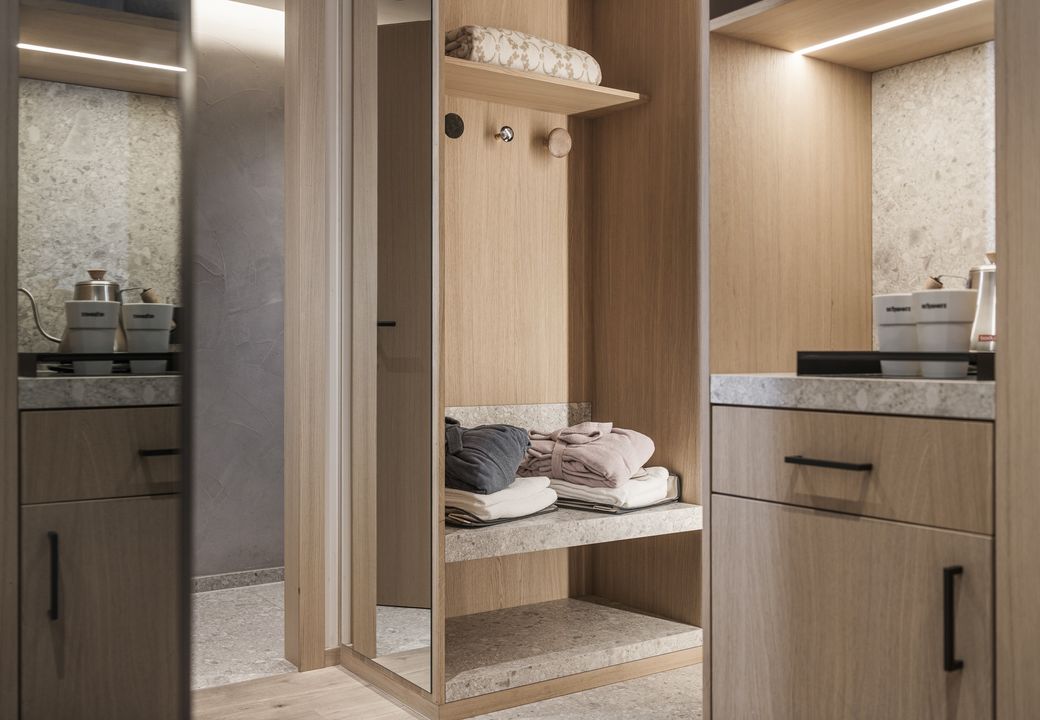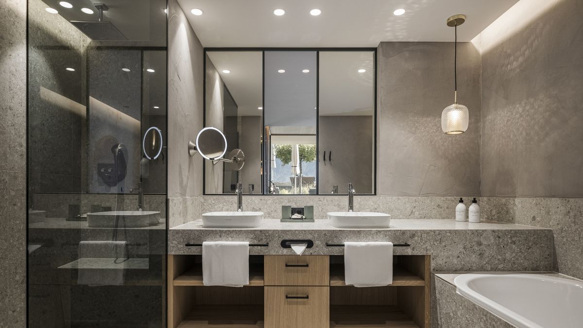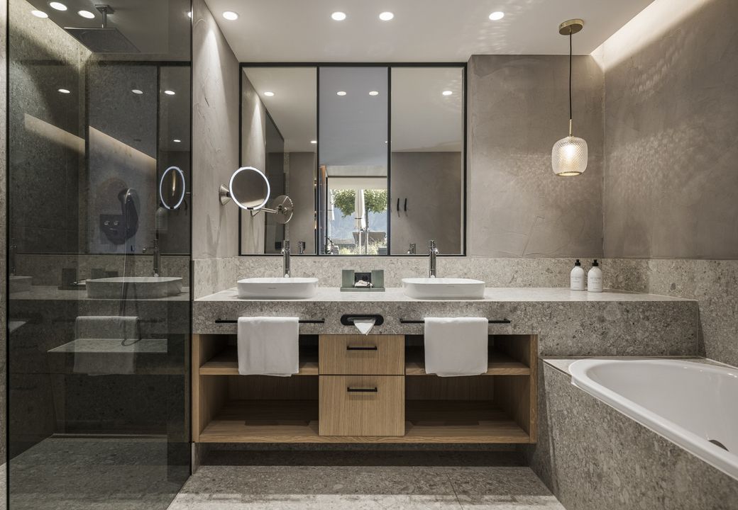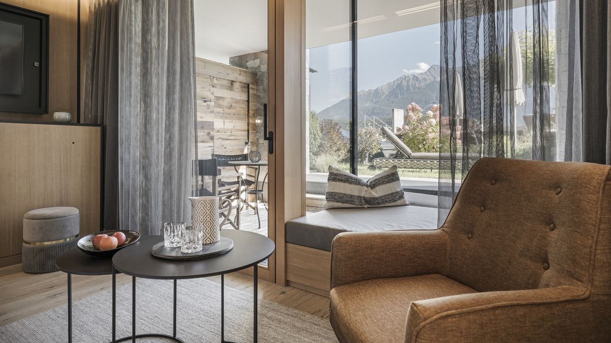 Modern ausgestattetes helles Doppelzimmer, hochwertiger Holzboden, Klimaanlage, großer Balkon oder Terrasse mit Ruheliege. Kingsize Doppelbett und Panorama-Sitzecke. Teilweise mit Hängesessel. Bad mit Dusche und Badewanne, Doppel-Waschtisch, WC separat.