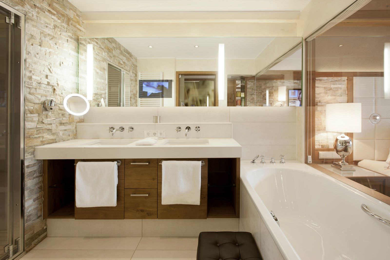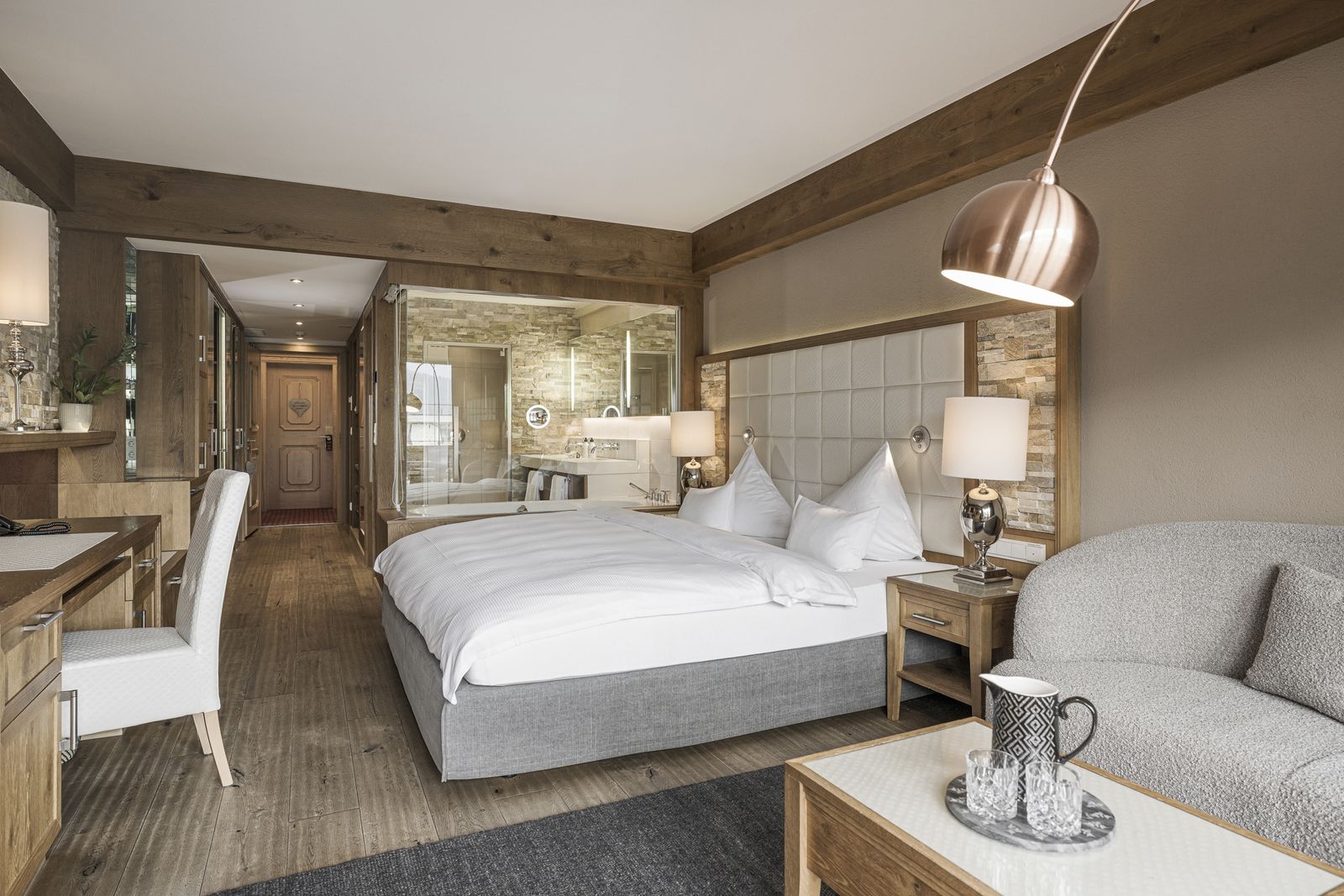 Living room/bedroom, approx. 40 m², with balcony, some with connecting doors, modern furnishings: Writing desk, seating area, luxury bathroom with bath and steam shower, separate WC, oak flooring