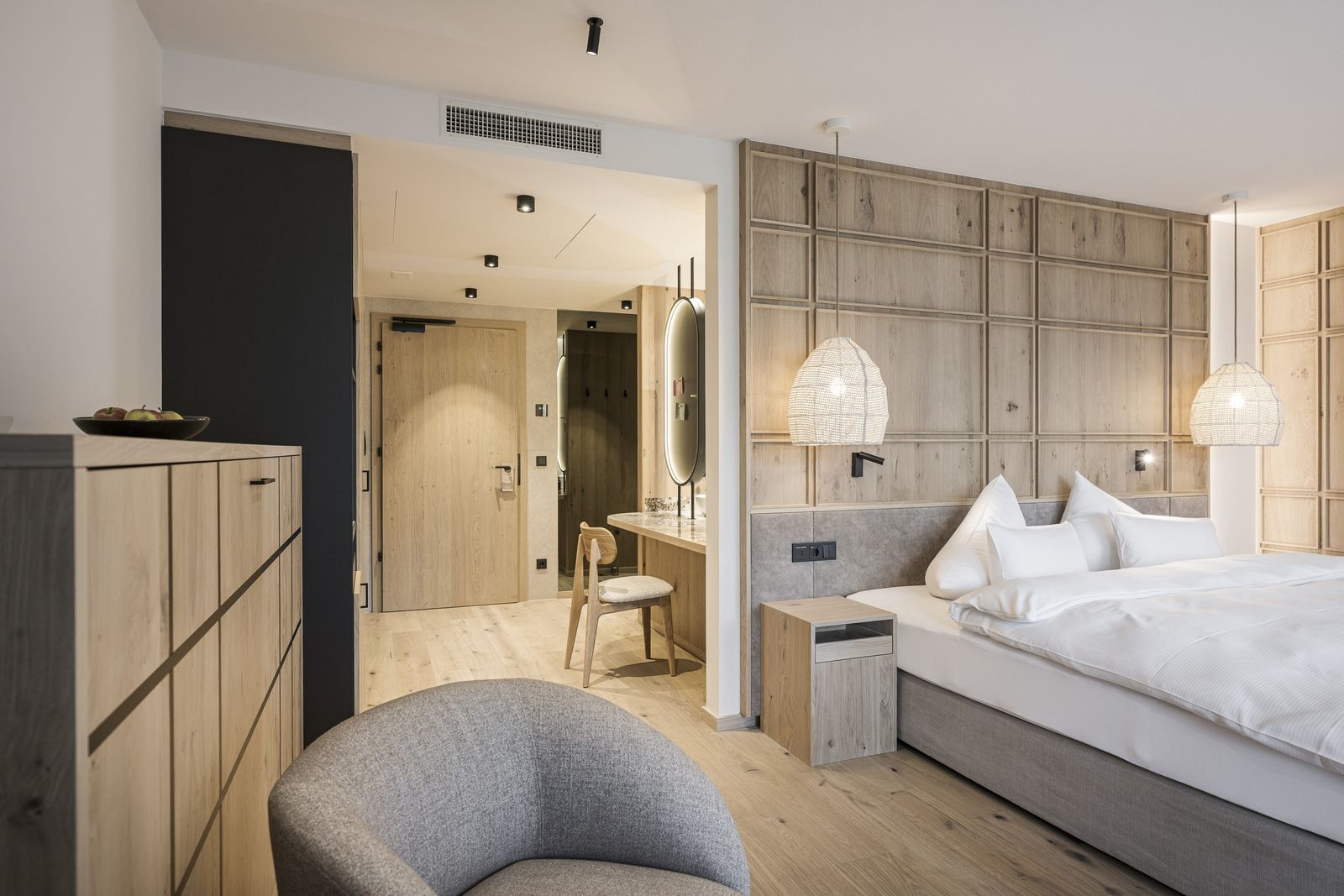Modern, bright double room, approx. 35m². Wooden floor, air conditioning, minibar, TV, bathroom with shower, double washbasin, separate WC, king-size double bed, balcony.
